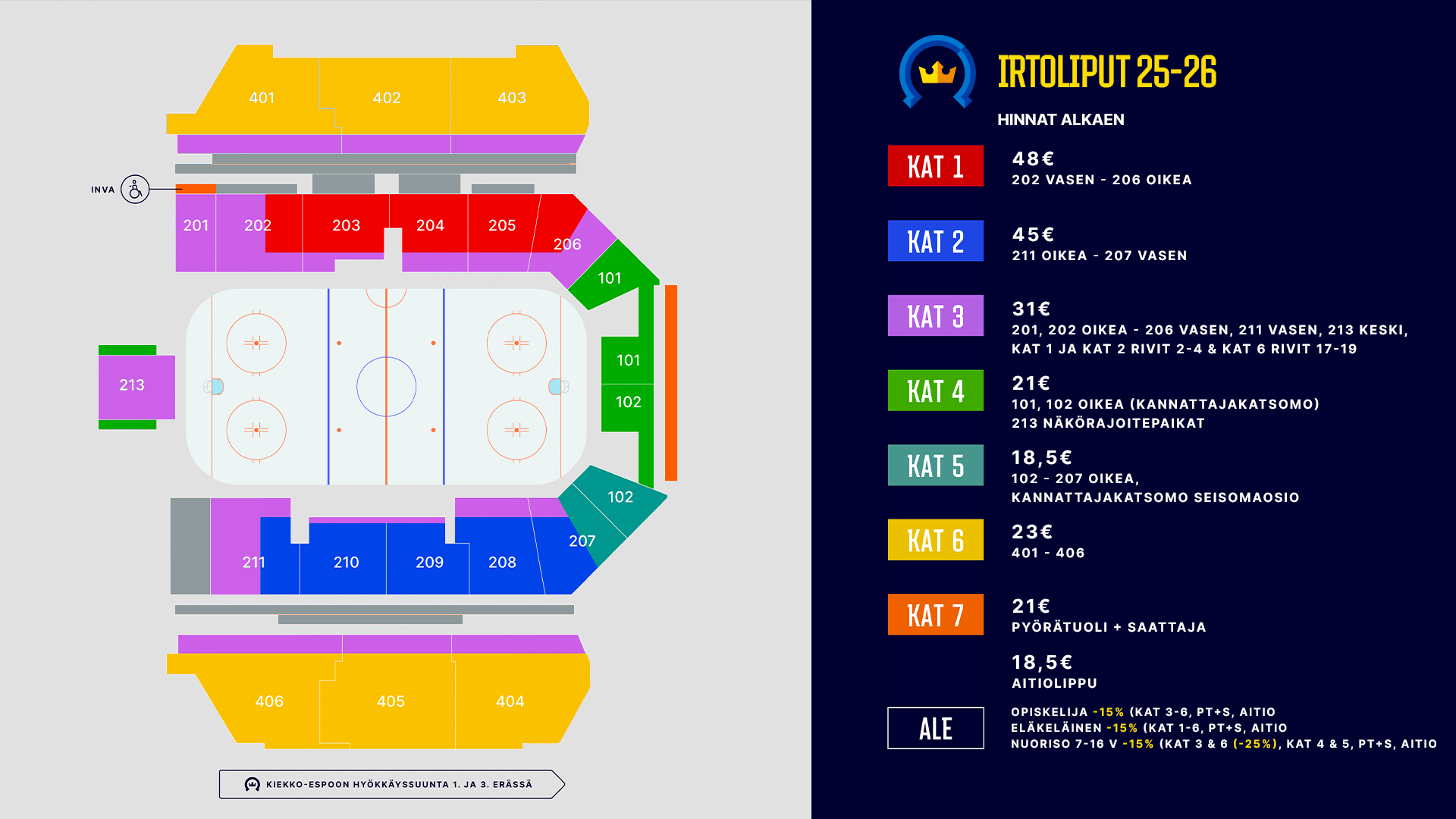 Alennusryhmiin kuuluvat eläkeläinen, opiskelija, varushenkilö ja nuoriso (7-16 vuotiaat). Nuorisolippu on tarkoitettu 7-16-vuotiaille. Alennukseen oikeuttava kortti on esitettävä pyydettäessä. Huomioithan, että alennukset ja niiden suuruus vaihtelevat kategoriasta riippuen. Alle 7-vuotiaat lapset pääsevät kotiotteluihin ilmaiseksi huoltajan seurassa (sisäänpääsyyn ei sisälly omaa istumapaikkaa).