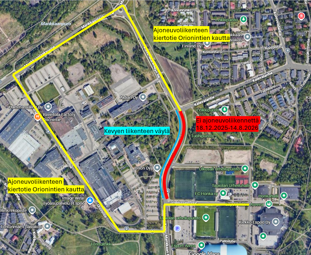Tapiolan Urheilupuiston uuden stadionhankkeen rakennusvaihe etenee. Koivu-Mankkaan tie suljetaan 18.12.2025 – 14.08.2026 väliseksi ajaksi. Suljettava alue rajautuu Koivu-Mankkaan tien ja Kalevantien risteyksestä Koivu-Mankaantien ja Urheilupuistontien risteykseen.
